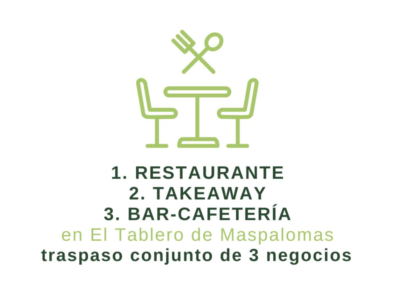 Se trata del traspaso conjunto de 3 negocios, en pleno funcionamiento, en El Tablero de Maspalomas: 1) Restaurante 2) Takeaway / Venta de comida para llevar 3) Bar- Cafetería con terraza